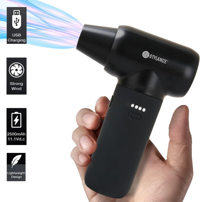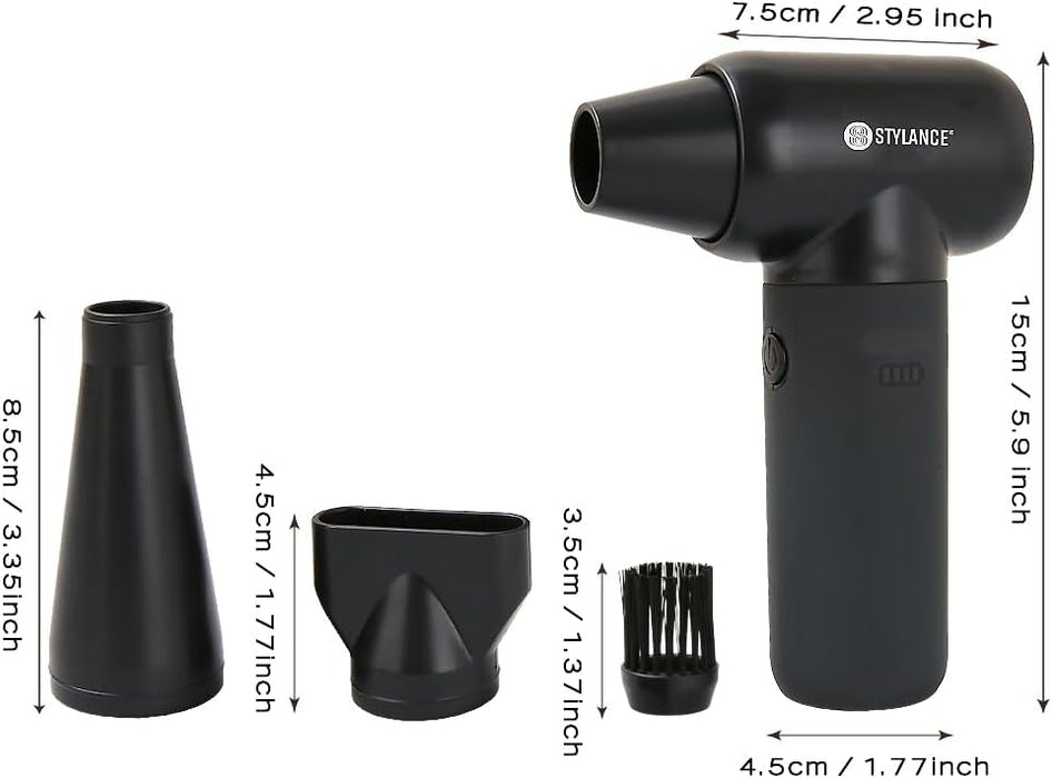 Equipado con una robusta batería de 11,1 V/2000 mAh, este soplador de aire ofrece una autonomía prolongada, permitiéndote atender a varios clientes sin interrupciones. Su práctico puerto de carga USB-C (5 V/2 A) garantiza una recarga rápida y sencilla, minimizando el tiempo de inactividad y maximizando la productividad.