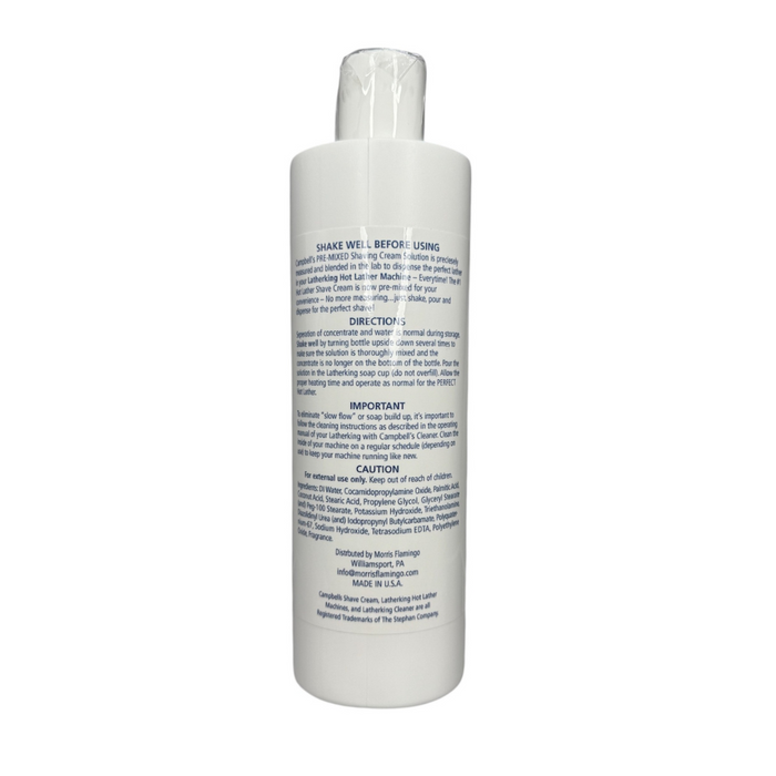 When using Campbell’s Pre-Mixed Liquid Shave Cream in a LatherKing hot lather machine, follow these directions for the perfect lather: First, gently shake by turning the bottle upside down several times to make sure the solution is thoroughly mixed and the concentrate is no longer on the bottom. Then, pour the solution into the LatherKing soap cup. Allow the proper heating time, and operate as normal for the perfect lather. Separation of concentrate and water is normal during storage.