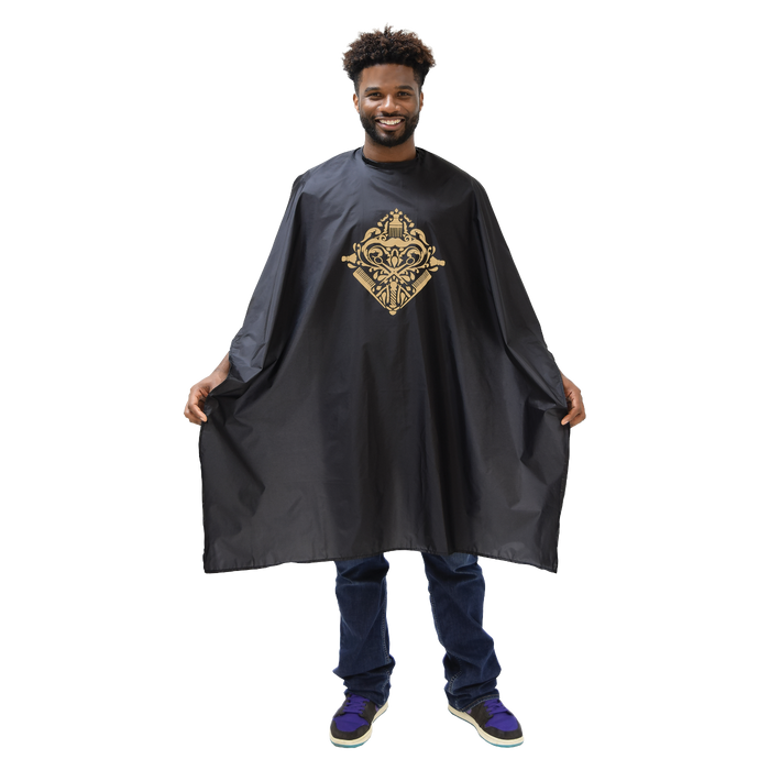 Black barber cape with trendy metallic gold design. Made of soft, durable, 100% nylon. Lightweight,waterproof, and stain-resistant. Machine washable. One size fits most. Snap neck closure. 48" x 58".